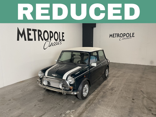 Een geheel nieuwe Mini Cooper in de kleuren donker groen met witte strepen.