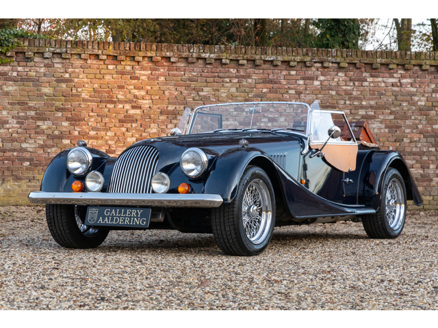 Er zijn sportwagens die indruk maken en er zijn sportwagens die een glimlach oproepen nog vóór u de sleutel heeft omgedraaid. Morgan weet dat gevoel als geen ander omhoog te brengen. Dit exemplaar uit 1998, uitgevoerd in het schitterende Lancia Blue met Cognac Beige leren bekleding, met bijpassend blauwe vloerbekleding, laat meteen zien waarom. Het is een kleurencombinatie die het tijdloze silhouet extra diepte geeft, alsof het ontwerp nooit door de jaren is veranderd maar enkel is verfijnd.