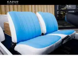 The body is finished in a fresh white color, paired with a blue leather interior — a timeless and stylish combination. At the rear, there is a wicker picnic basket, a charming detail that suits the relaxed character of the car.