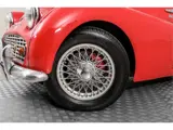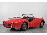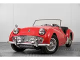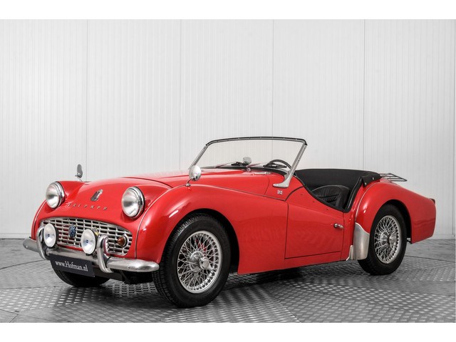 Triumph TR3A 1959, met spaakwielen en een kofferrek, De TR2 t/m de TR4 werden voorzien van de robuuste 4 cilinder Standard motor die ook is gebruikt in de Ferguson trekkers indertijd. Deze Triumph is meer dan 25 jaar in het bezit geweest van de vorige eigenaar. In 1953 verscheen de TR2 op de markt. Een vooruitstrevende model die gevolgd werd door de succesvolle reeks TR3,TR3A ,TR3B, TR4, TR5, TR6, TR7 en ten slotte de TR8. Een tweede lijn sportwagens werd gevormd door de Spitfires en de GT6. Daarnaast werd er ook nog een luxe sportwagen gemaakt: De 8 cilinder Stag.