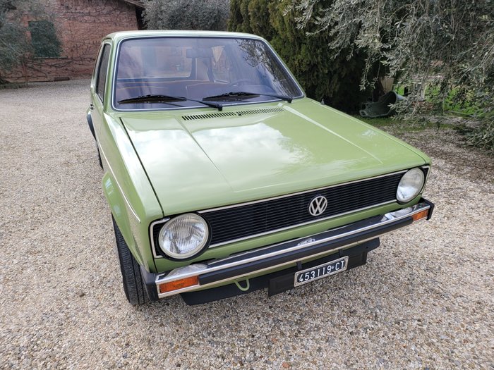 Zeldzame Golf, eerste serie met kleine chromen bumpers en klein achterlicht, 3-deurs in GL-uitvoering. Kleur: Manilla Grun met intactkaramel velours interieur, nieuwe matten uit die tijd.