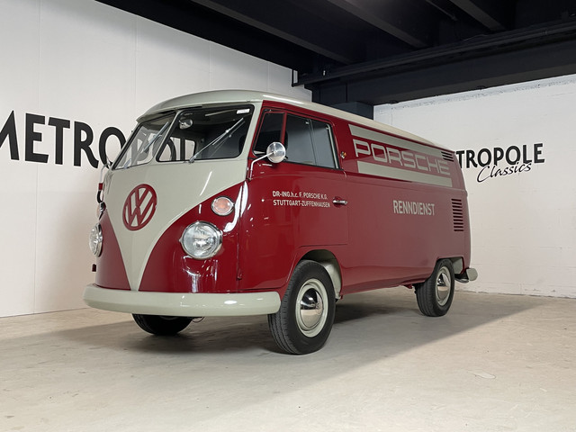 Deze bestelbus hier is totaal gerestaureerd naar concoursniveau. Hij rijdt ook perfect. Uitgevoerd in rood met een beige interieur. Wij hebben de bus bestikkerd met de logo's van Porsche Renndienst. Een prachtige bus voor liefhebber.