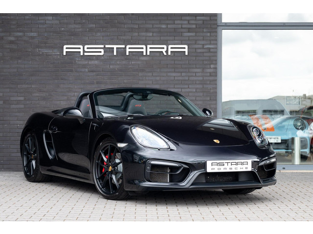 Porsche 981 Boxster GTS uit 2016, uitgevoerd in diepzwart metallic met een zwart leder/alcantara met...