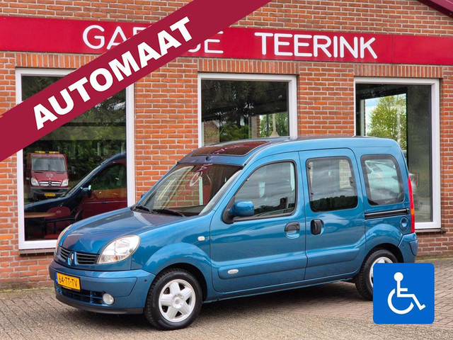 Nette Renault Kangoo Privilege automaat aangepast voor rolstoelvervoer door middel van kniel systeem. Complete rolstoelauto van tweede eigenaar die onder andere is voorzien van airco, cruise control, mistlampen, stuurbekrachtiging, elektrische ramen voor, centrale deurvergrendeling op afstand, 14 inch lichtmetalen velgen, glazen dak voorin en een originele radio/cd-speler.