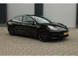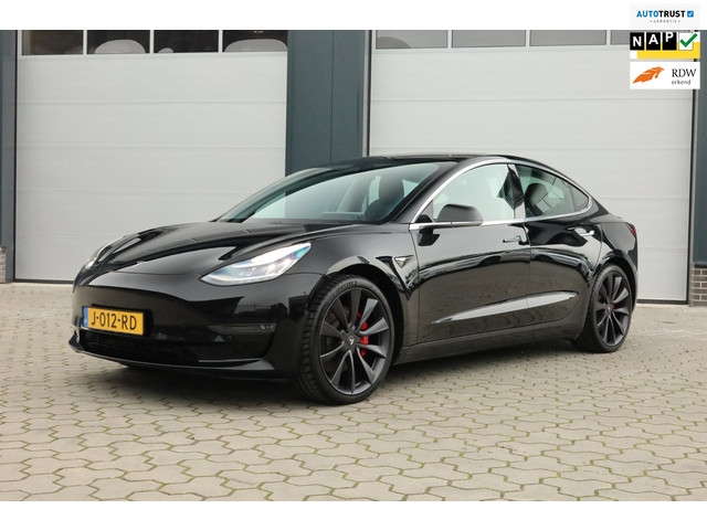 Strakke Model 3 in diepzwart met panoramadak. Deze Performance versie beschikt over een sterkere motor, grotere remmen en ander onderstel dan zijn ook al niet misselijke broertjes. Felrode remklauwen geven deze Tesla een extra sportief voorkomen.