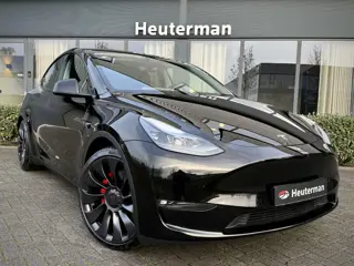Sportief samengestelde Tesla Model Y Performance AWD 75 kWh. Origineel Nederlands (NAP) geleverd, van eerste eigenaar afkomstig en rooklucht vrij! Voorzien van 21" Tesla Turbine lichtmetalen velgen in het antraciet, rode remklauwen, glazen panoramadak, Autopilot 4, stoelverwarming en achterbankverwarming, privacy glas, zwart optiek exterieur...