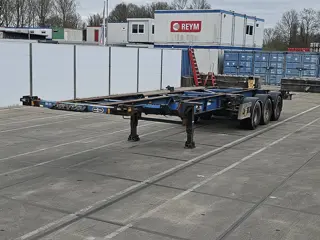 Aantal Assen: 3, Eigen gewicht: 6480 kg, Totaalgewicht: 38000 kg, Soort chassis: Volledig chassis, Materiaal chassis: staal, Kingpin afmeting: 2 inch, Vering type: vollucht, Kleur: Blauw, ABS (Anti Blokkeer Systeem), Twistlocks: 1x20, Merk as: BPW, 1x20ft; BPW