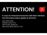 The General Terms and Conditions of Heinhuis are applicable to all adverts, offers and quotations by Heinhuis, all agreements entered into by Heinhuis and the negotiations preceding them. By any form of response you accept the applicability of the General Terms and Conditions of Heinhuis and you declare that you have taken note of these General Terms and Conditions. Our prices are export netto prices.