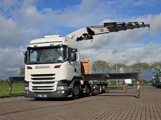 Aantal Assen: 4, Configuratie: 8x2, Diesel inhoud totaal: 400 liter, Aanhangwagen kopp., Dikte koppelingspen: 40 DIN, Schotel type: Fixed, Aantal sperren: 1, Centrale smering, Soort cabine: slaapcabine, Cruise control, Tachograaf, Digitale tachograaf, Airconditioning, Stand airco, Standkachel, Elektrische ramen, Elektrische spiegels, Radio/cassette, GPS navigatie, Kleur: Wit, Verwarmde spiegels, Soort lampen: Halogeen, Stoelverwarming, Bluetooth, Zwaailichten, Motorvermogen: 360 Kw (483 Hp), Brandstof: diesel, Euro: 6, Soort versnellingsbak: Opti-cruise, Merk versnellingsbak: Scania, Versnellingen: 12, Extra remsysteem, Merk retarder: Scania, Stuurbekrachtiging, ABS (Anti Blokkeer Systeem), ASR (Anti Slip Regeling), PTO, PTO soort: 1, Start accu, Pomp, Centrale vergrendeling, Stoelopstelling: 1+1, Stoelbekleding: Stoelhoes, Stoel verstelling: Handmatig, Kraan, Kraan merk: HMF 6020-OK6, Bouwjaar kraan: 2014, Capaciteit kraan: 60, Max. belasting: 2640 kg bij 16,9 m., Aantal steunpoten: 4, CE goedgekeurd, Positie bediening: zijbediening links, Afstandsbediening, Positie kraan: achter de cabine, Hydr. uitschuifbaar: 6 keer, Extra hydr. Aansl.: geen, Lasthaak