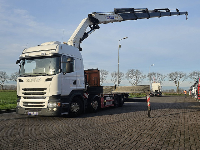 Aantal Assen: 4, Configuratie: 8x2, Eigen gewicht: 18740 kg, Totaalgewicht: 35000 kg, Diesel inhoud totaal: 400 liter, Aanhangwagen kopp., Dikte koppelingspen: 40 DIN, Schotel type: Fixed, Aantal sperren: 1, Centrale smering, Vering type: luchtvering, Soort cabine: slaapcabine, Cruise control, Tachograaf, Digitale tachograaf, Airconditioning, Standkachel, Elektrische ramen, Elektrische spiegels, Radio/cassette, GPS navigatie, Kleur: Wit, Verwarmde spiegels, Soort lampen: Halogeen, Stoelverwarming, Bluetooth, Zwaailichten, Motorvermogen: 360 Kw (483 Hp), Brandstof: diesel, Euro: 6, Soort versnellingsbak: Opti-cruise, Merk versnellingsbak: Scania, Versnellingen: 12, Extra remsysteem, Merk retarder: Scania, Stuurbekrachtiging, ABS (Anti Blokkeer Systeem), ASR (Anti Slip Regeling), PTO, PTO soort: 1, Start accu, Twistlocks: 1x20, Pomp, Centrale vergrendeling, Stoelopstelling: 1+1, Stoelbekleding: stof, Stoel verstelling: Handmatig, Kraan, Kraan merk: HMF 6020, Bouwjaar kraan: 2015, Capaciteit kraan: 60000, Max. belasting: ?, Aantal steunpoten: 4, Positie kraan: achter de cabine, Hydr. uitschuifbaar: 6 keer, Lasthaak