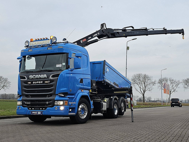Aantal Assen: 3, Configuratie: 6x2, Eigen gewicht: 14145 kg, Totaalgewicht: 27000 kg, Diesel inhoud totaal: 400 liter, Aanhangwagen kopp., Dikte koppelingspen: 40 DIN, Schotel type: Fixed, Aantal sperren: 1, Lichtmetalen velgen, Vering type: luchtvering, Soort cabine: slaapcabine, Cruise control, Tachograaf, Digitale tachograaf, Airconditioning, Standkachel, Elektrische ramen, Elektrische spiegels, Radio/cassette, Kleur: Blauw, Verwarmde spiegels, Soort lampen: Halogeen, Laneassist, Climatecontrol, Stoelverwarming, Bluetooth, Dodehoek detectie, Zwaailichten, Motorvermogen: 427 Kw (573 Hp), Brandstof: diesel, Euro: 6, Soort versnellingsbak: Opti-cruise, Merk versnellingsbak: Scania, Versnellingen: 12, Extra remsysteem, Merk retarder: Scania, Stuurbekrachtiging, ABS (Anti Blokkeer Systeem), ASR (Anti Slip Regeling), PTO, PTO soort: 1, Start accu, Aantal zijden: 3 zijdig kippend, systeemtype: ., Pomp, Centrale vergrendeling, Stoelopstelling: 1+1, Stoelbekleding: stof, Stoel verstelling: Handmatig, Kraan, Kraan merk: Hiab X-HIPRO 162 ES-3, Bouwjaar kraan: 2017, Capaciteit kraan: 16, Max. belasting: 1200 kg bij 10 m., Aantal steunpoten: 2, CE goedgekeurd, Positie bediening: zijbediening links, Afstandsbediening, Positie kraan: achter de cabine, Hydr. uitschuifbaar: 3 keer, Lasthaak, R580 LB 6X2*4 MNA / HIAB X-HIPRO 162 ES-3/ 1ST OWNER READY TO GO / FULL SERVICE HISTORY