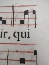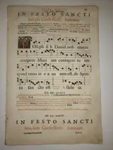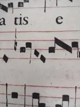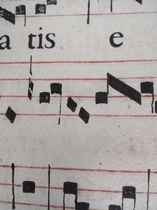 Origineel blad met gregoriaans, waarschijnlijk geschreven in het Latijn tussen de 16e en 17e eeuw, met voor- en achterkant. Hoogstwaarschijnlijk boekdruk van benedictijnse monniken uit Zuid-Duitsland. Handgeschept papier van oude ingekookte materialen en houten vaten, linnenachtig, hoge kwaliteit. Verworven bij de liquidatie van antiquariaat K. Schubert in 2013 in Mannheim, Duitsland. De bladen zijn absoluut origineel en komen uit een antifonarium dat in een zeer slechte staat verkeerde en slechts een deel van het totale aantal pagina's kon worden bewaard.