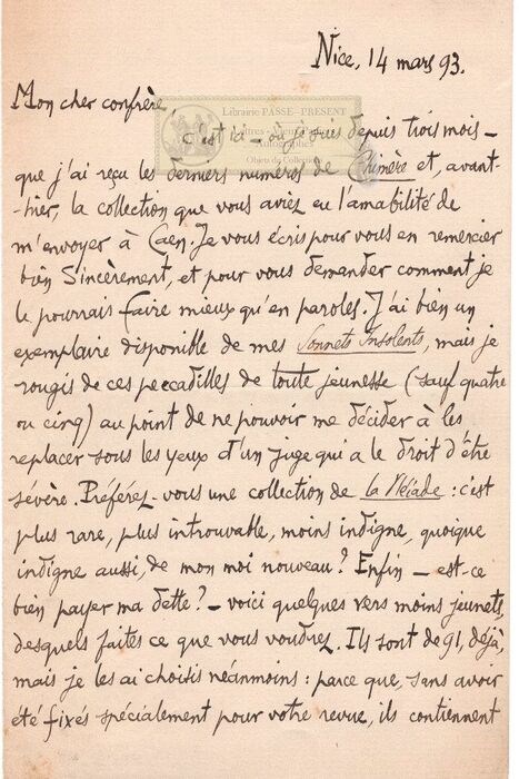 Ik heb wel een exemplaar van mijn onbeschaamde Sonnets beschikbaar, maar ik bloos om deze zeer jonge peccadillo's (behalve vier of vijf) tot het punt dat ik mezelf er niet toe kan brengen ze terug te brengen onder de ogen van een rechter die het recht heeft om streng zijn. Geeft u de voorkeur aan een verzameling van La Pléiade (recensie die hij samen met Albert Aurier had opgericht en die teksten publiceerde van Barrès, Viele Griffin, Rachilde Henri de Régnier, enz.): die is zeldzamer, moeilijker te vinden, minder onwaardig , hoewel ook mijn nieuwe zelf onwaardig?
