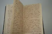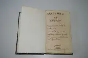 Bovenste wit schutblad vervangen door een handgeschreven titel in een ander handschrift ("Geneviève de Brabant/ 1810"). Pittoresk briefje ms. oud: "Dit boek van een onschuldige [sic] werd gekocht in 1859, in Turijn, onder de portieken van de rue du Pô". -