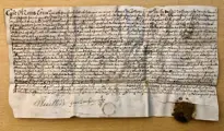 Wordt geleverd met het intacte zegel van het baljuwschap dat aan de randen is afgebroken en een vlek heeft, ondertekend door James de Hauilland en Jean Le Mesurier.
