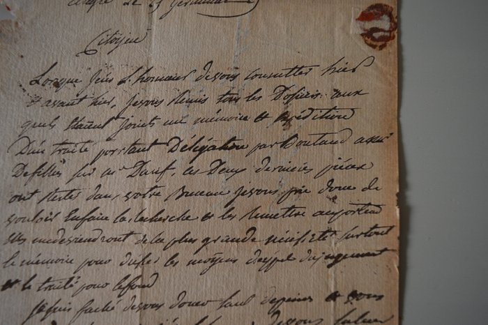 Handgeschreven brief gedateerd 21 Germinal (10 april 1793), gericht aan de wetgever van de gemeente Vauzelles, ondertekend Laurand