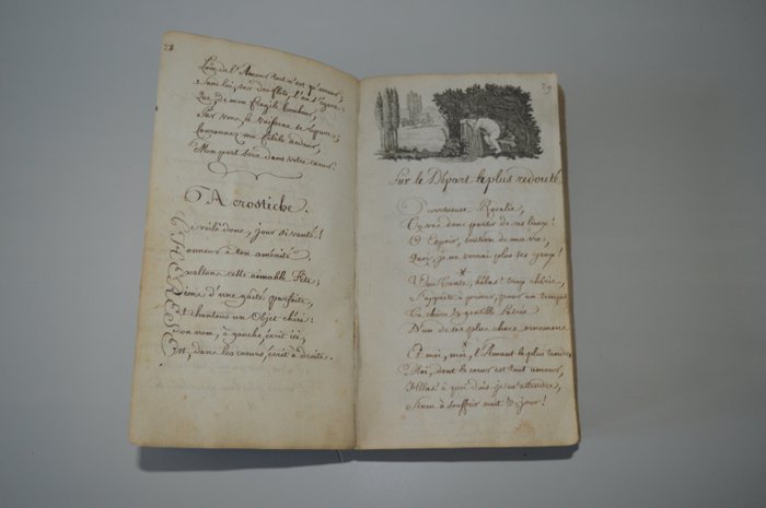 Dit exemplaar is geïllustreerd met 6 gegraveerde vignetten, waarvan er één gesigneerd G. Jacowick en de andere Cardon, met landelijke thema's, evenals een gouachevignet met een roos.