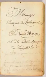 Mélanges Poëtiques & Littéraires geschreven door Louis Mercx in fijn cursief handschrift in bruine inkt.