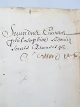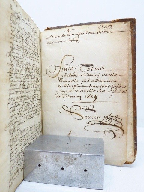 Uitzonderlijk manuscript, volledig in pen geschreven in de 17e eeuw, inclusief een cursus kosmologie van 352 pagina's, in 8vo-formaat, getiteld "Secundus Cursus philosophiae Ludivici Sousis arundis", wat vertaald kan worden als "De tweede cursus filosofie door Ludovic Sousi". Handtekening van de auteur op het colofon met de datum 1689.