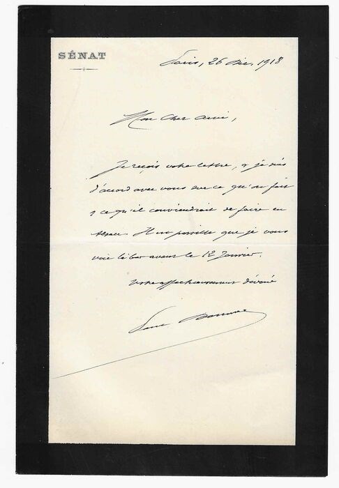 Zeer mooie handtekeningbrief ondertekend door Paul Doumer, Frans staatsman, president van de republiek van 13 juni 1931 tot aan zijn dood, vermoord op 7 mei 1932.