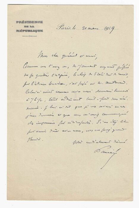 Raymond Poincaré - Président de la République française - belle lettre autographe signée - 1919