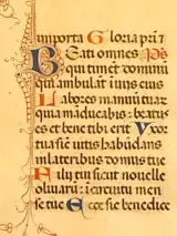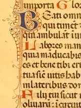 Wir bieten Ihnen ein Originales Blatt und Lateinische Handschrift aus einem mittelalterlichen Stundenbuch an. Die Handschrift wurde in schwarz-brauner, blauer und roter Tinte auf Pergament verfasst. Gotischer Schrifttyp Vorder- und Rückseitig mit juwelen 12 Zeilen.