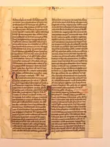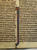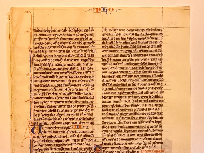 Wir bieten Ihnen ein Originales Blatt und sehr frühe lateinisch Handschrift aus einer mittelalterlichen Bibel an. Die Handschrift wurde in zwart Tinte auf Pergament verfasst. Frühgotischer Schrifttyp in zwei Spalten Vorder- und Rückseitig mit jeweils 47 Zeilen. Met Federwerk-initialen in rood en blauw en decoratief Ranken- en Federwerk.