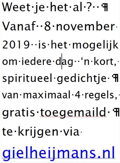Origineel spiritueel kort gedichtje (maximaal 4 regels)dagelijks in je inbox, gratis, jawel !Nu aanmelden op: gielheijmans.nl