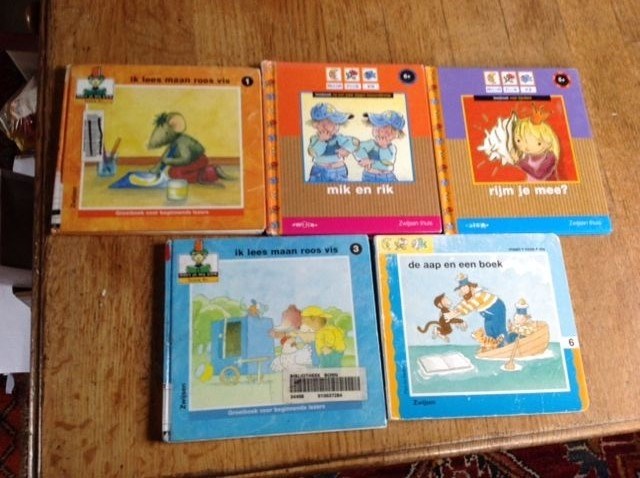 Maan roos vis - per stuk- 1,75 - serie 1 - 2 roos -3 mmmm…. – 6 - Pen - serie 2 - 1 vis, vis , een teen – serie 3 – boekje aap ik lees maan roos vis – 3- mik bijt! – Pom en de reus – een huis met een naam - 4- het boek van beer - niet voor de poes - een kip op de wip leesboek voor kleuters 5+, – 2,- per stuk – rijm je mee 2 ------------------ maan roos vis letter kwartet - verzamel zo snel mogelijk 4 woorden waarin dezelfde letter voorkomt. - Dit maan roos vis kwartetspel is bedoeld voor kinderen die leren lezen. Zij kunnen zo thuis spelenderwijs oefenen met de letters en woordjes die ze op school moeten leren. - Voor kinderen vanaf 6 jaar. - Compleet + z.g.a.n. 4,50