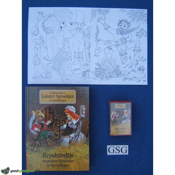 Het luistersprookje van Repelsteeltje is kompleet met cassettebandje en de vier kleurplaten (onbeschreven). De sprookjes en verhalen in dit boek zijn zodanig bewerkt dat uw kind er veel plezier aan zal beleven. Voor de allerkleinsten onder ons wordt het verhaal voorgelezen op een luistercassette. De verhalen en de sprookjes worden hierdoor extra spannend. Een kind dat naar de cassette luistert en tegelijk de tekst leest, hoort een "belletje" als de bladzijde omgeslagen moet worden. Kinderen die nog niet kunnen lezen kunnen bij de voorgelezen tekst de plaatjes in het boek volgen. Het klassieke sprookje in dit boek is Repelsteeltje. Verder bevat dit boek: Thomas en de menseneter, De sprekende taart, De hamer van thor de god van de donder, De gelukkige prins, Aldo de vliegende stofzuiger, De vliegende mens uit almelo, De boze rat, Abdoellah en de geest in de fles, De dans van de kreeften, floortje de leeuwentemster, De geest van kapitein been en De mol en de waterrat.