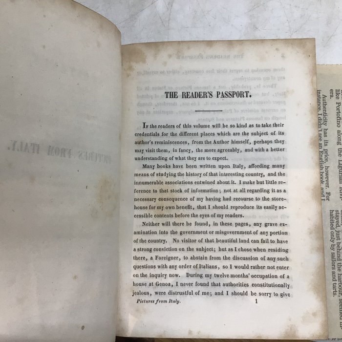 "Pictures from Italy" door Charles Dickens - Leipzig, Bernard Tauchnitz - 1846 eerste copyrighteditie - 14cmx12cm - conditie: zeer goed, gebonden in fijne perkamenten band met decoratieve rugelementen, compleet, met wat roestvlekjes op de pagina