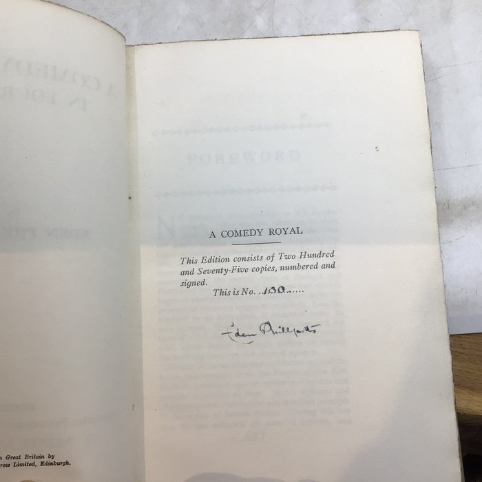 1. "A Comedy Royal in four acts" by Eden Phillpotts - T. Werner Laurie, London - 1925 in eigen beheer gedrukt voor abonnees - 166p - gelimiteerde oplage van 275 exemplaren, dit is nr. 130 gesigneerd door Eden Phillpotts - 18cmx15cm - staat: zeer goed , wat wrijving aan planken, compleet