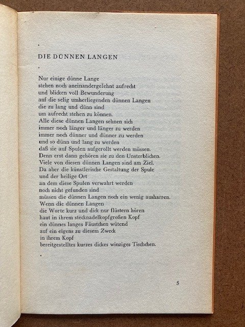 9 (met Jan Tschichold) – Der gestiefelte Stern – Zürich: Die Arche, 1978 – 40 pp., gekartonneerd met omslag – 1ste druk – Facsimile-uitgave van door de typograaf Tschichold geredigeerde proefdruk van nooit verschenen uitgave – Zeer mooi exemplaar met zeer licht verkleurd omslag.