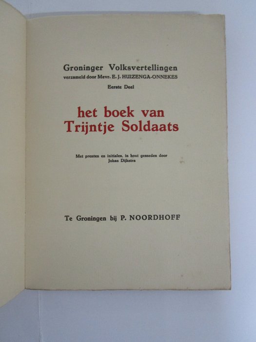 2) Huizenga-Onnekes, E.J. (ed.). - Het boek van Trijntje Soldaats. ,Gron., P. Noordhoff 1958, 2e druk., (4),75,(2)p. met houtsneden en illustraties en vignetten van J. Dijkstra,originelehoutsnede op voorplat geplakt. - boekblok los en gebroken. Sticker op voorplat. Wat vlekken.