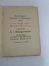 1) Huizenga-Onnekes, E.J. (ed.). - Het boek van Minne Koning. Gron., P. Noordhoff, 1e druk, 1930, (6),115,(4)p., - met houtsneden en illustraties en vignetten van J. Dijkstra, met originelehoutsnede op voorplat geplakt - gedrukt in zwart en meerdere kleuren in een oplage van 600 exemplaren door H.N. Werkman. - boekblok zit los, verder wat vlekjes en gebruikssporen.