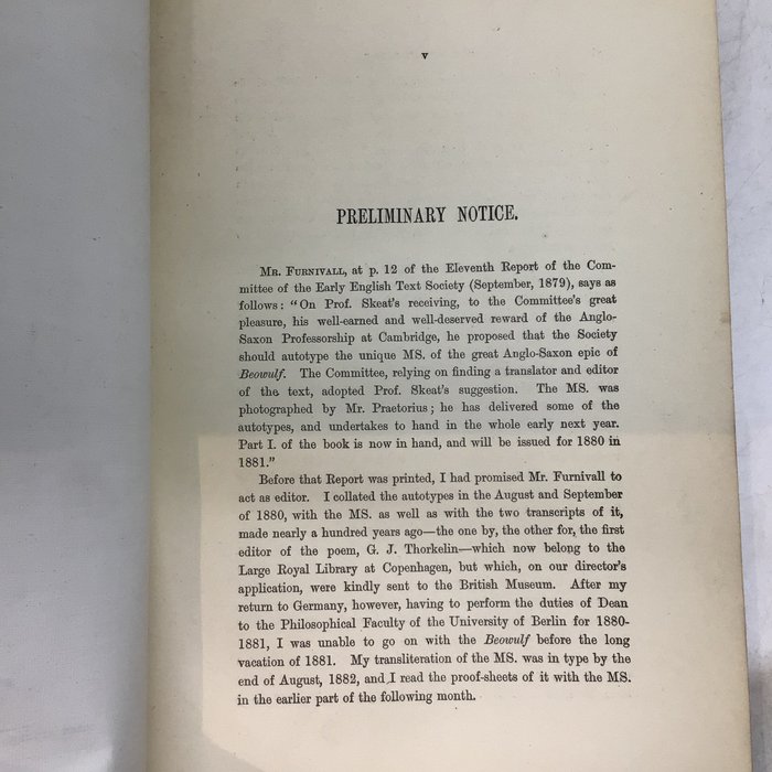 "Beowulf - autotypes of the unique cotton Ms. Vitellius Axv in the British Museum" met een transliteratie en aantekeningen door Julius Zupitza - N. Trubner, London - 1882 first UK edition - 18cmx15cm - conditie: goed, gebonden met ex-lib markeringen, compleet met alle manuscriptplaten