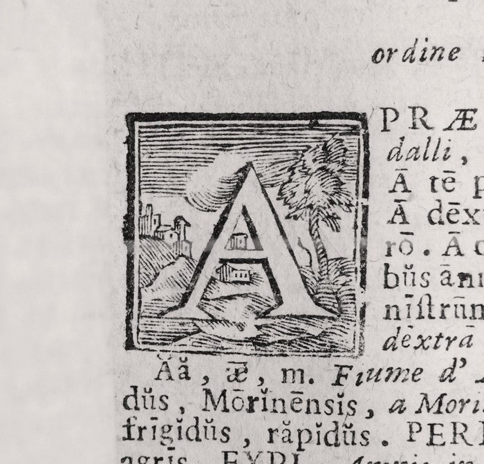 p.p. XXVI, 804. Hedendaagse halfharde perkamenten band met handgeschreven titel op de rug, verdonkerd door de tijd. Perkament ontbreekt in sommige delen, platen en rug. Gedeeltelijk losgemaakte voorplaat. Gepolijste snijwonden, wijdverspreide bloemen. Tekenen van gora in de bovenmarge van sommige pagina's. Geperforeerde beschadigde eindkappen. Paginagrote allegorische gravure op de frontispiece ontworpen door Pietro Antonio Novello en gegraveerd door Filippo Ricci, het stelt de muzen voor onder een gevleugeld paard op de top van een berg, twee vrouwen die de berg beklimmen en aan de voet de Schrift met een boek en een pen en Apollo geeft een lauwerkrans aan de Schrift. Gegraveerd vignet op de titelpagina en manuscript Ex libris.