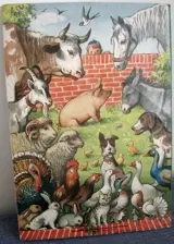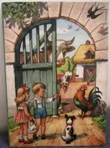 Originele korte uitgave zonder tekst circa 1960 jaar - Peter en Sally op de boerderij - Pop-up kinderboek met illustraties van beroemde Tsjechische illustrator Vojtech Kubasta, formaat 32,5cm x 22,5cm. De problemen: kleine vouw in het gezicht van de jongedame, tweede kleine scheur in de hondfiguur en kleine scheur nabij het midden van de voorste boog.
