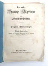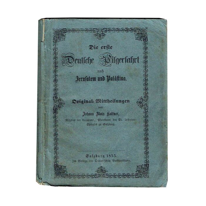 Johann Alois Kaltner: De eerste Duitse bedevaart naar Jeruzalem en Palestina. Originele mededeling van Johann Alois Kaltner, lid van de Karavane, kapelaan van het St. Johanns-Spital in Salzburg. Salzburg: Oberer'sche Verlagsbuchhandlung (Endl & Penker) 1855. Kl.-8°. [1nn. Bl. (titel)], [zn. pp. I-III (toewijding), pp. IV-VIII, [nn. blz. 1], blz. 2-206. Originele uitgeversbrochure met sierlijk ingelijste omslagtitel.