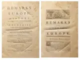 BREVAL John. Opmerkingen over verschillende delen van Europa. London Bernard Lintot 1726. Eerste editie. Onvindbare originele uitgave van het reisverslag in Europa door de beroemde Engelse schrijver en reiziger. De geschiedenis, oudheden en geografische beschrijvingen van de Europese landen waar de auteur doorheen reisde. Uitgebreide en diepgaande beschrijving van Nederland en Holland met zijn provincies, Zeeland, Friesland, Vlaanderen, Brabant met bijzondere aandacht voor de steden Utrecht en Groningen. De reis gaat door België en de stad Namen, Luxemburg en Frankrijk. De provincies Elzas, Lotharingen, La Franche Comtè en de steden Lyon, Dijon en vele andere. Eerste deel. Vintage leren band. Gouden titel op rug. Geribde rug geheel versierd met vergulde friezen met kleine imperfecties. Schitterend allegorisch paneel op het frontispice. Een geografische kaart van Frankrijk en Nederland. Geïllustreerd met tien platen met afbeeldingen van steden en monumenten. Groot formaat 40x27, pp. 12nn, 257, 5nn. Halo's op de witte marges van verschillende pagina's. Heel goede staat.