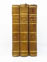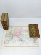 Contemporain gebonden exemplaar. Half bruine schapenvacht. Gladde rug versierd met vergulde ijzers. Gewreven leer, scheuren aan bovenkappen. delen 2, 3 en mors sup. van volume 2 (3 cm). Gebruikssporen op het servies. Stevige volumes. Binnenwerk: gebruinde schutbladen, watervlek in bovenmarge. van de titel en ca. de eerste 30 pagina's van deel 3. Scheur zonder gebreken voor de kaart van Australië (10 cm), zeldzame foxing. Klein hoekig gemis op het laatste tafelblad van deel 3.