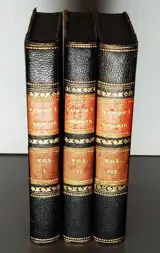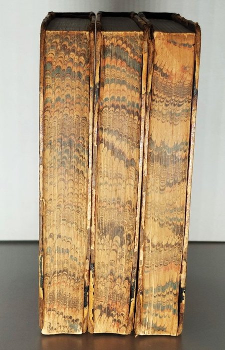 Prachtig gebonden in halfkalfsleer op oranje en blauw gemarmerd hardboard, gemarmerde bijpassende schutbladen en paginaranden. Vergulde banden en rood lederen titel- en auteursblokken met vergulde letters. Rug vernieuwd, omslagen geschaafd. Stevige binding, geen losse of ontbrekende pagina's. Deel I - 272 pagina's, deel II - 321 pagina's, deel III - 354 pagina's. 15 x 10 cm.