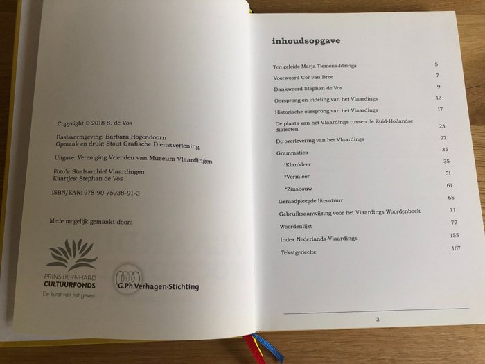 Het boek bevat ruim 1000 woorden en uitdrukkingen, waarvan een groot aantal voorzien is van voorbeeldzinnen in sappig Vlaardings. Voorts bevat het hoofdstukken over de klankleer, vormleer, zinsbouw, herkomst en plaats van het Vlaardings. Tenslotte zijn ook vrijwel alle teksten geschreven in het Vlaardings verzameld en in chronologische volgorde te lezen