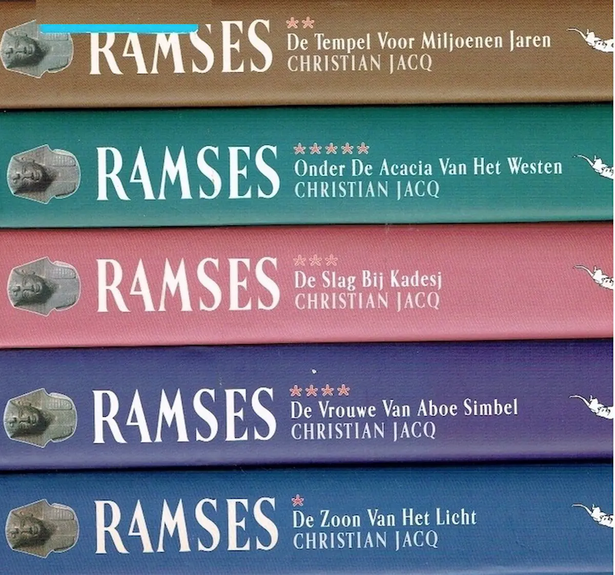 Christian jacq - ramses de zoon van het licht 3 eerste deel de rebelse en onstuimige ramses is het jongste kind van de machtige farao seti. De oudste zoon, de berekende chenar ziet zichzelf als vanzelfsprekende opvolger, maar zijn vader seti heeft andere plannen. In het geheim bereidt hij ramses voor om hem op te volgen. Zal ramses de hofintriges overleven...? Het oude egypte. Een duizenden jaren oude cultuur en beschaving met één hoeder, de farao. Hij, de zoon van ra, is de middelaar met de goden. De meest legendarische farao is ramses ii, de grote bouwmeester en machtige strijder. De begunstigde van de goden, die meer dan zestig jaar regeert. Nieuwstaat, mooie kaft en omslag,. 5,- ========================================================================== De tempel voor miljoenen jaren 2 deel 2 de tempel voor miljoenen jaren is het tweede deel van zijn verhaal. Ramses staat op het punt farao te worden. Zijn moeder, zijn geliefde nefertari en zijn trouwe vrienden staan hem bij zijn zware taak te vervullen. Maar uiteindelijk kunnen alleen de goden de jonge farao helpen om de valstrikken van zijn broer chenar te doorzien. Ramses besluit een tempel voor miljoenen jaren te bouwen om zo de gunst van de goden te verwerven...Nieuwstaat, mooie kaft en omslag,. 5,- Christian jacq - ramses - de vrouwe van aboe simbeldeel 4het oude egypte. Is er een beschaving die meer tot de verbeelding spreekt? Een duizenden jaren oude cultuur, met één hoeder: de farao. Hij, de zoon van ra, is de middelaar met de goden, de beschermer van de twee landen. De meest legendarische farao is ramses ii. De grote bouwmeester die ongekend veel schitterende monumenten laat oprichten. De machtige strijder die de grenzen van het rijk verlegt: van mesopotamië tot diep in afrika. De gunsteling der goden, die meer dan zestig jaar regeert. Dit is zijn verhaal. Nieuwstaat, mooie kaft en omslag,.5,-