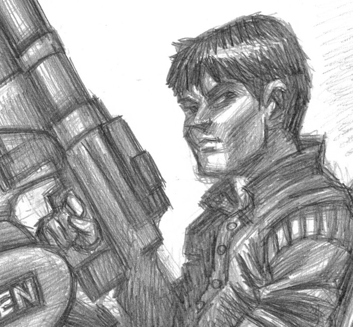Deze verbluffende originele tekening toont Shotaro Kaneda, de hoofdrolspeler van de Akira, en zijn futuristische, hightech motorfiets en een iconisch kenmerk van de serie.