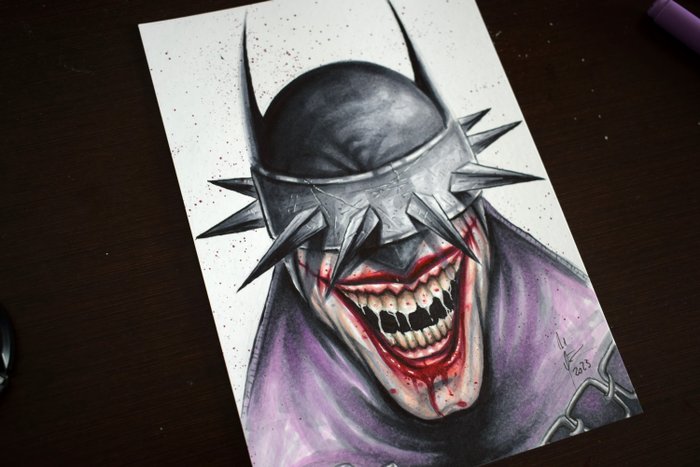 Deze ongelooflijke originele illustratie is gemaakt met stiften, over het Dc Comics-personage "Batman die lacht" en is gemaakt door de kunstenaar Pablo Such geboren in 1984, Alicante, Spanje.