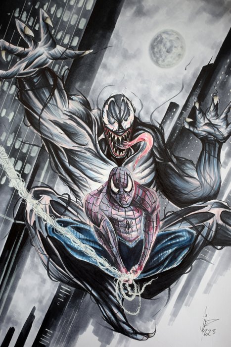 Deze ongelooflijke originele illustratie is gemaakt met stiften, over de Marvel Comics-personages "Venom en Spiderman" en is gemaakt door de kunstenaar Pablo Such geboren in 1984, Alicante, Spanje.