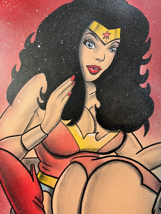 Werk met acrylverf en spuitbus op canvas. Afgelakt met dubbele vernislaag.