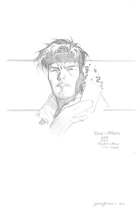 Potloodtekening die Gambit voorstelt met een van zijn beroemde kaarten waarop hij zijn energie overbrengt.