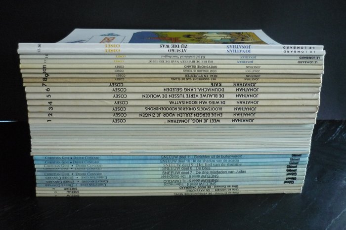 Adler 1 t/m 10 en compleet, Jonathan deel 1 t/m 16 (minus deel 13) en Sneeuw 1 t/m 11. Alle albums in eerste druk en zeer fraaie staat. Jonathan deel 1 t/m 3 zijn van uitgeverij Helmond, deel 5, 6, 8 en 9 van Lombard/Albracht, de overige delen van Lombard. Jonathan deel 12 heeft een sticker op de cover. Er is nergens in geschreven, een potloodprijsje is mogelijk. Zie ook de foto's.